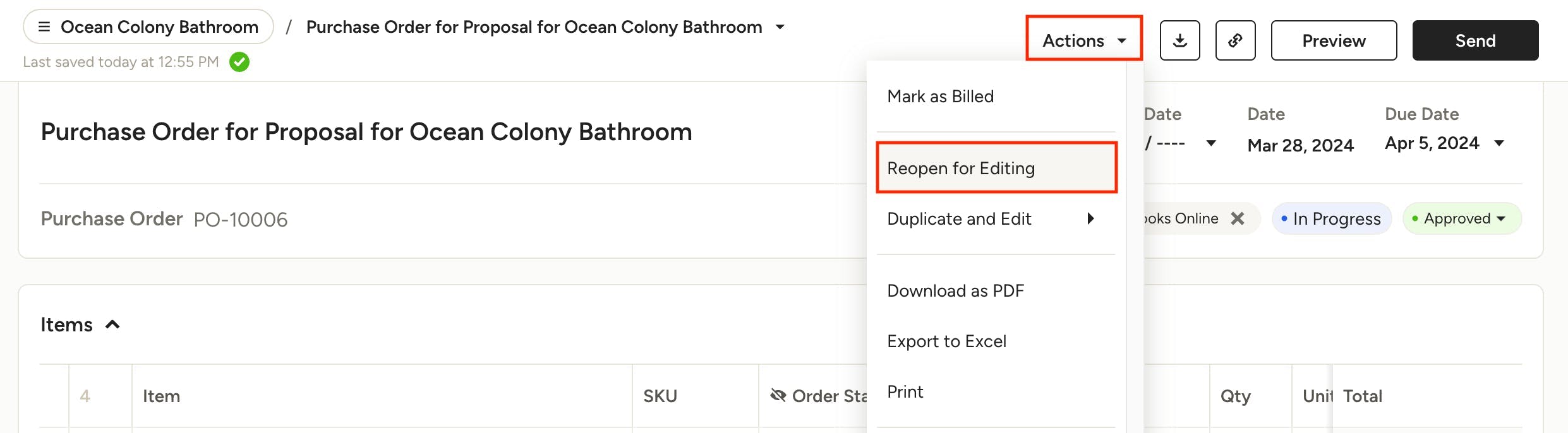 1. Open up the purchase order you would like to edit. Select the Actions dropdown, and find Reopen for Editing.