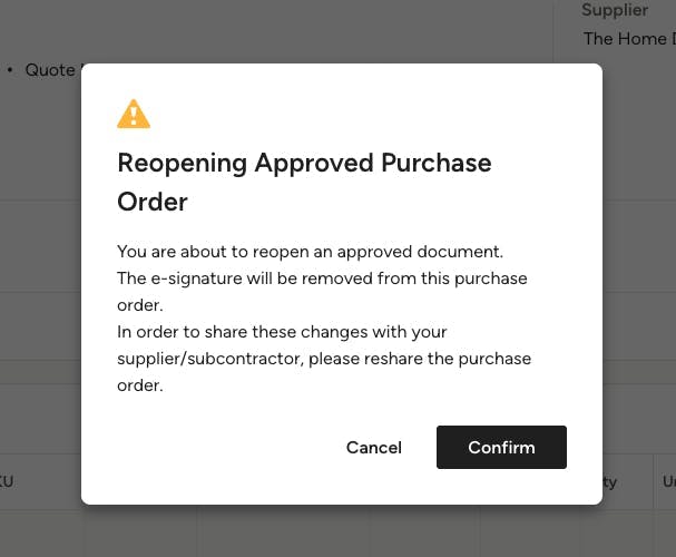 Once a purchase order is approved, you will need to reopen it if changes are needed. The supplier or subcontractor won’t be notified that you’ve reopened the purchase order for editing until you reshare it with them.