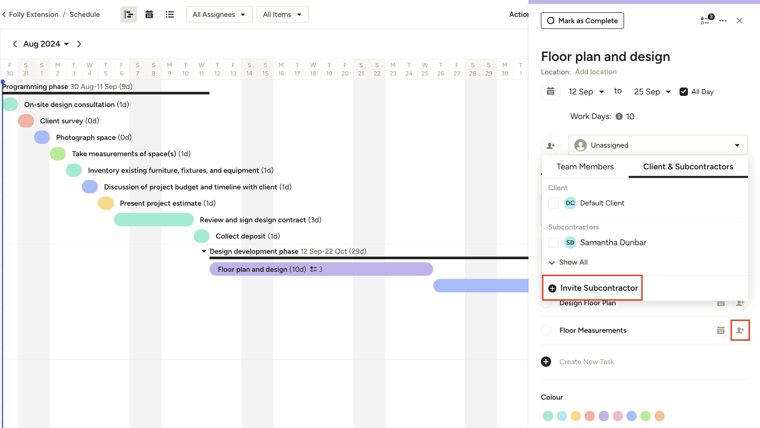On a Schedule Item: Click the team dropdown and select the Client & Subcontractors tab. From here, you can click Invite Subcontractor and fill in their information to invite them to the project and assign them to the item.