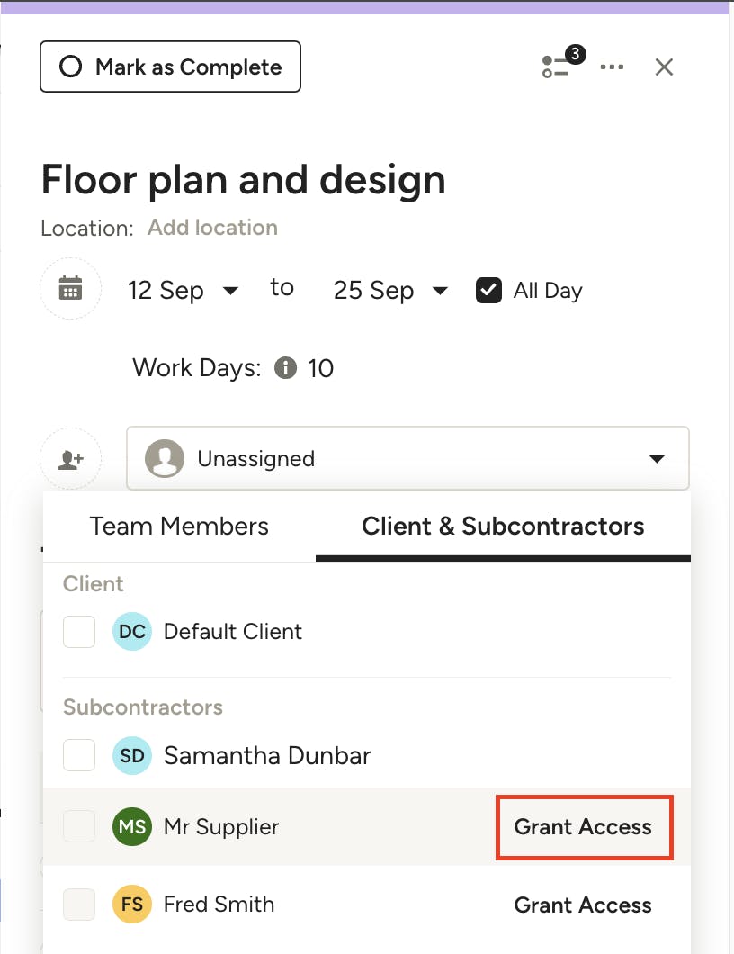 Pro Tip: To quickly give an existing subcontractor access to a project and assign them a schedule item or task in one step, click Grant Access next to their name in the Client & Subcontractors section of the team dropdown.