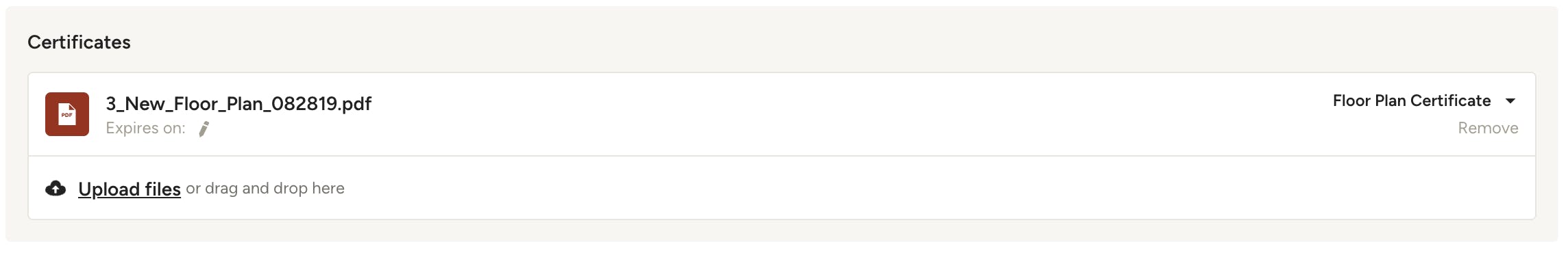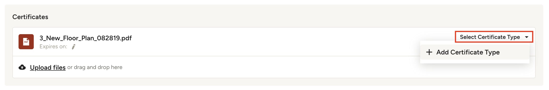 Once you upload a file, you can select the documentation type from the Select Certificate Type dropdown. If you don't see a relevant type listed, you can add your own at the bottom of the dropdown.