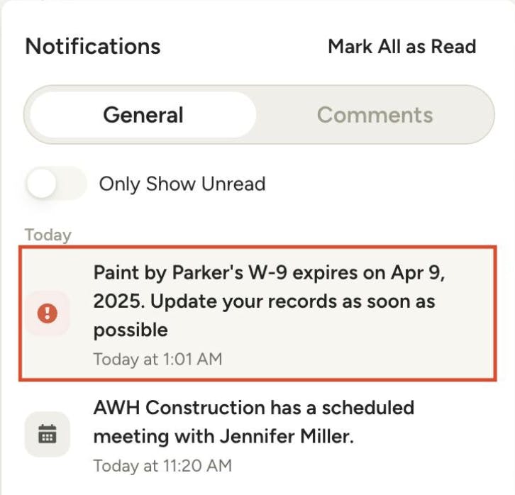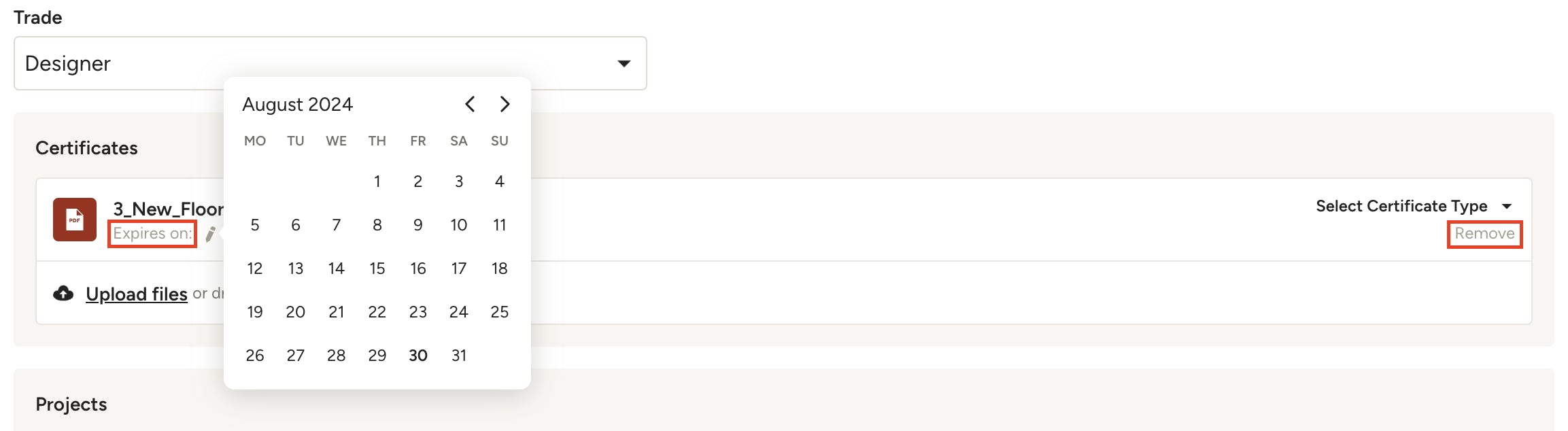 If you enter an expiration date for a subcontractor's certificate, you will receive multiple notifications in Houzz Pro, as well as an email 7 days and 1 day prior to that date, letting you know that specific certificate needs to be updated soon. Both the Super Admin and any team members with relevant subcontractor permissions will be notified.