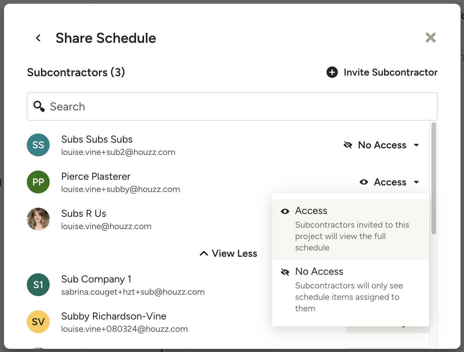 To share your schedule, go to your project and select Schedule from the left-hand menu. Click on the Share icon – you can then specify Access/No Access next to each individual subcontractor. If a subcontractor is set to Access, they can view the full schedule. If a subcontractor is set to No Access, they can only view schedule items assigned to them. Learn more