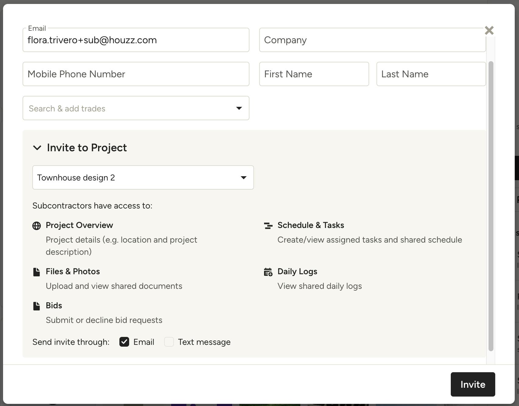 3. Click Invite to send. The subcontractor will now be added to your subcontractor list and will also receive an invitation to collaborate on that specific project.