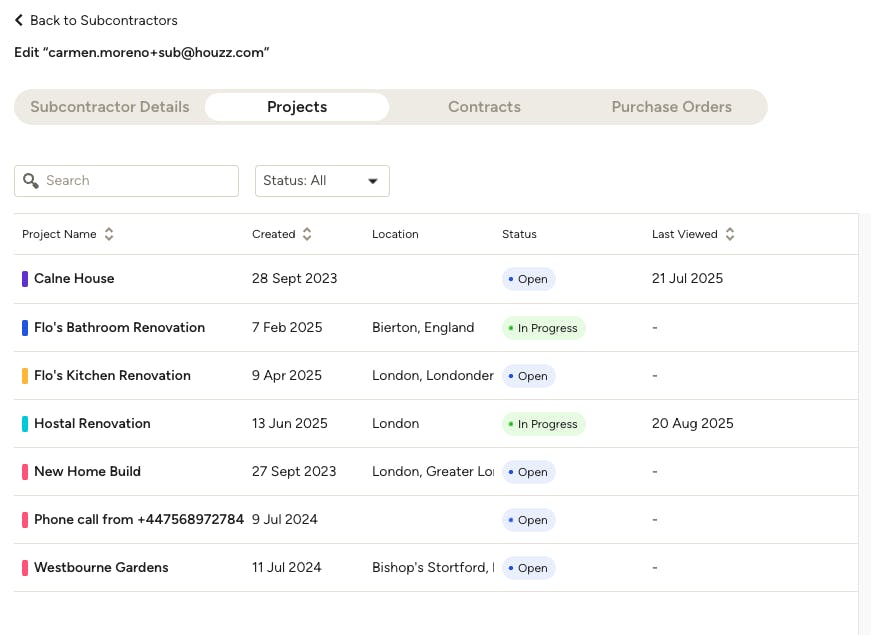 In this tab you can easily see which projects a specific subcontractor has access to, including relevant project info like location, status, and when the sub last viewed the project. Click on any project to be taken to the project overview page.