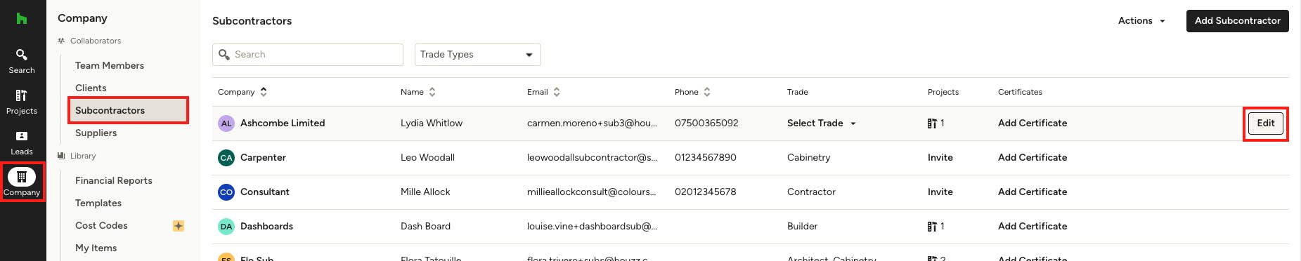 Once you add a subcontractor, you can easily view and edit information in the subcontractor list. To view your subcontractors, select the Company icon in the left navigation, then select Subcontractors from the left menu. This screen will list all your existing subcontractors. To edit a sub's details, click Edit on the far right.