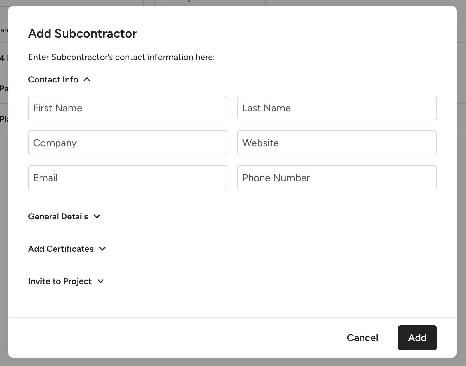 If you don't want to invite the subcontractor to a project, skip the Invite to Project section and just click the Add button at the bottom. The subcontractor will now be added to your subcontractor list, but no invitation will be sent.