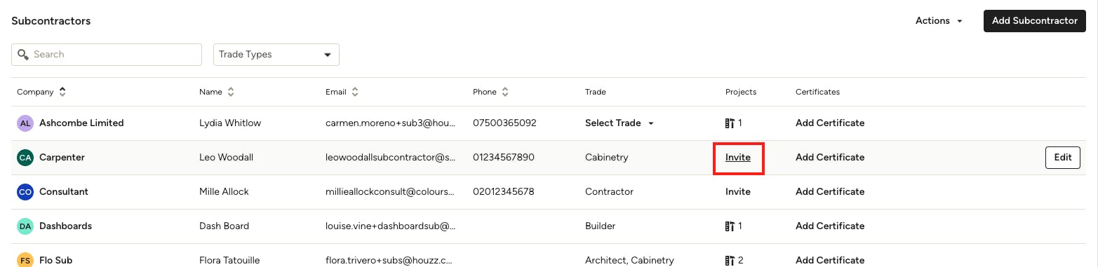 Note: Once you have invited a subcontractor to a project, you cannot add or edit their email or phone number.