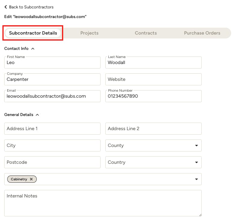 Within Edit mode, you'll see relevant tabs at the top: Subcontractor Details, Projects, Contracts and Purchase Orders. Select the tab according to the information you want to access.