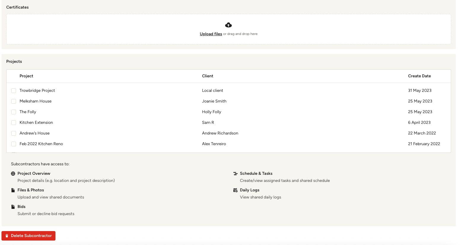 Even when you add a subcontractor within your general settings, you will still need to give them access to each individual project. You can give access to specific projects when you edit the subcontractor's information (more details above).