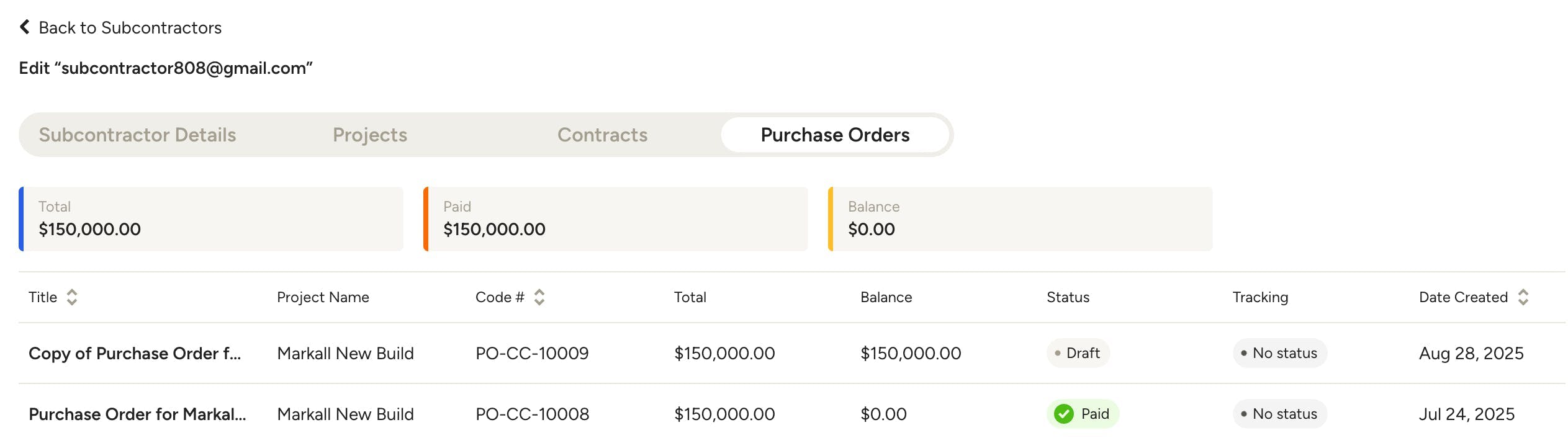 In this tab you can see any purchase orders associated with the specific subcontractor, including their Total, Paid and Balance. Click on any purchase order to open the document.