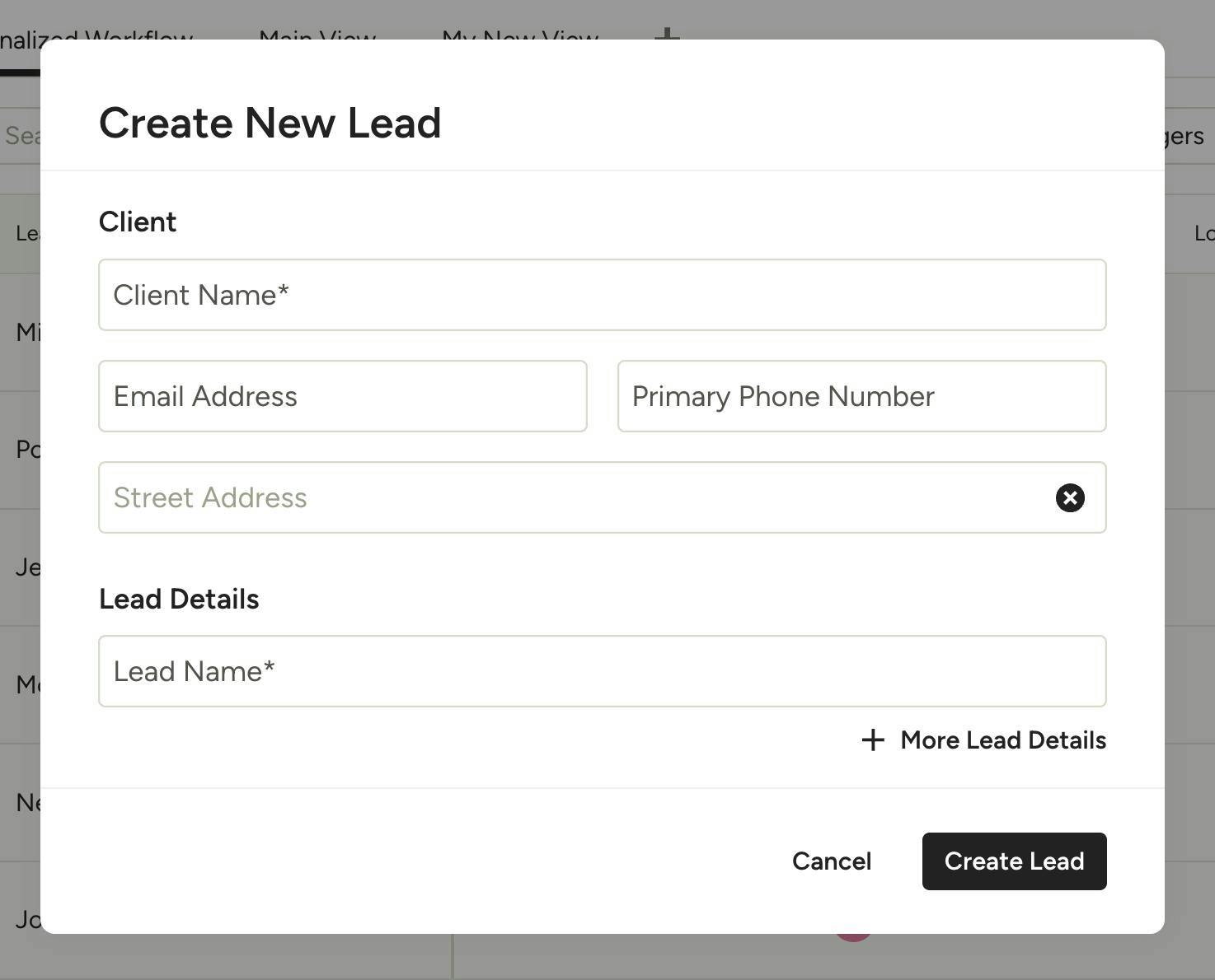 If you select Create New Lead, you will need to manually input the lead name, email address, phone number, home address, and lead name. Click More Lead Details to add more information, such as lead source, start date, estimated profit, revenue, and more.