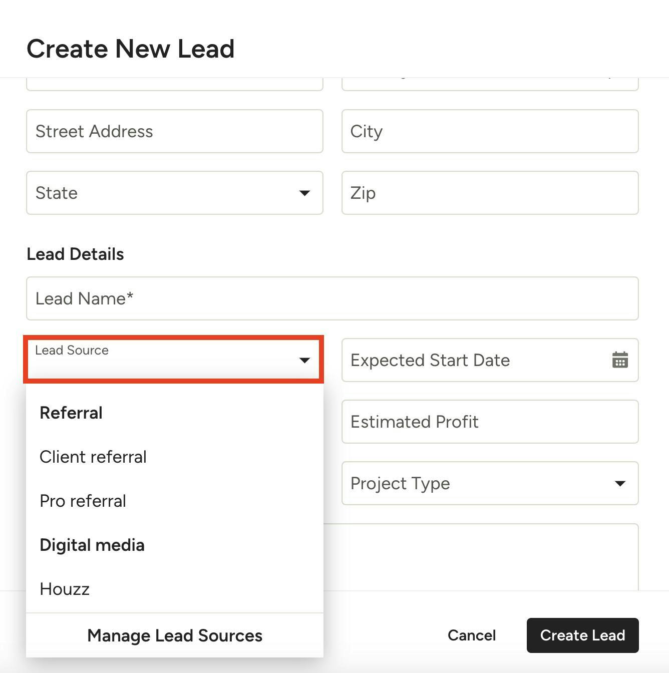 You can also add your own custom lead sources by clicking on Manage Lead Sources at the bottom of the dropdown menu.
