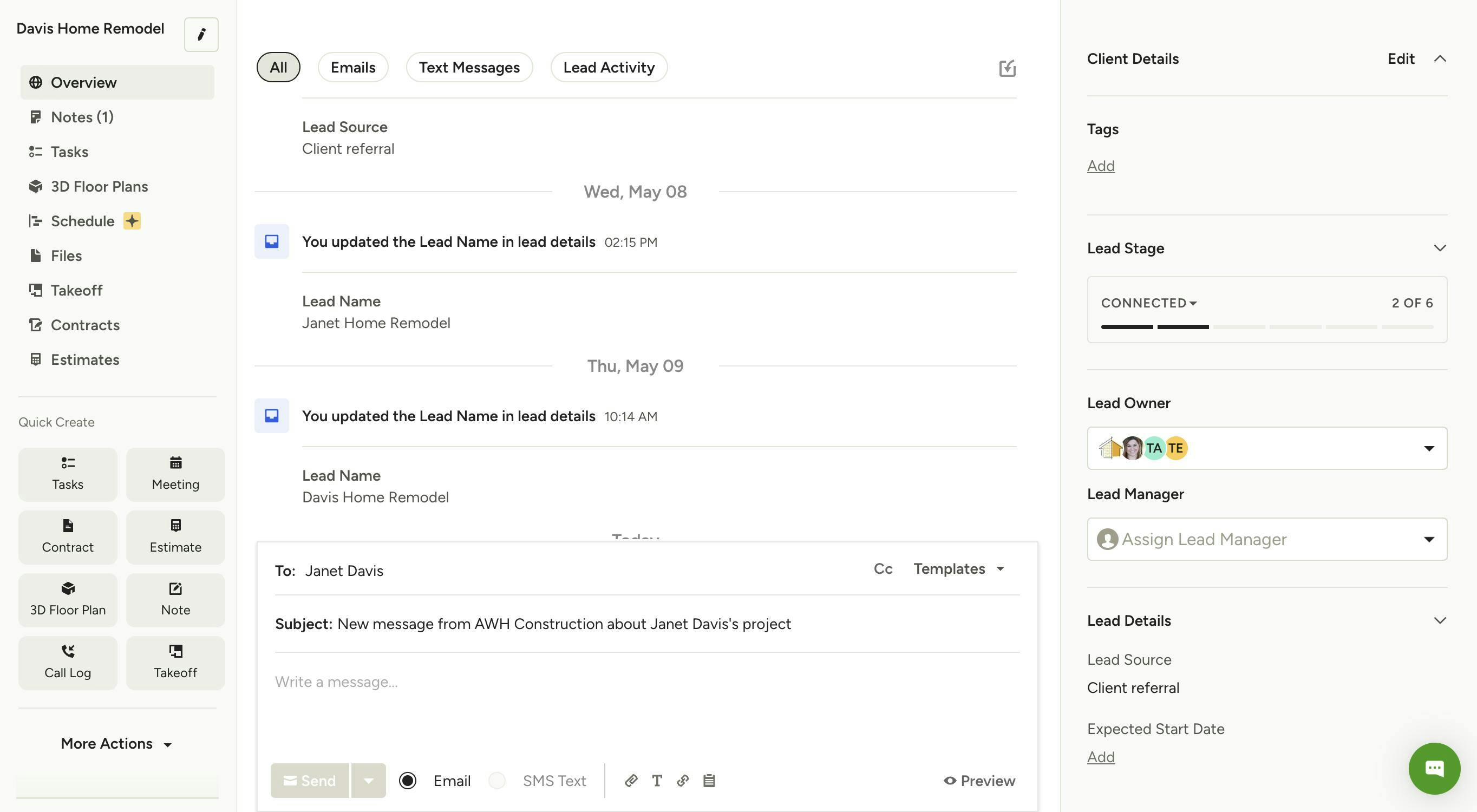 On the left side of this page, you can navigate to relevant project features, including project overview details, notes, tasks, 3D floor plans, schedule, files, takeoff, contracts and estimates / proposals. You can also use the Quick Create menu to quickly add a new task, meeting, contract, estimate/proposal, 3D floor plan, and more. You can convert to a project if the lead is won, and you can Delete, Archive, Print or Snooze under More Actions.