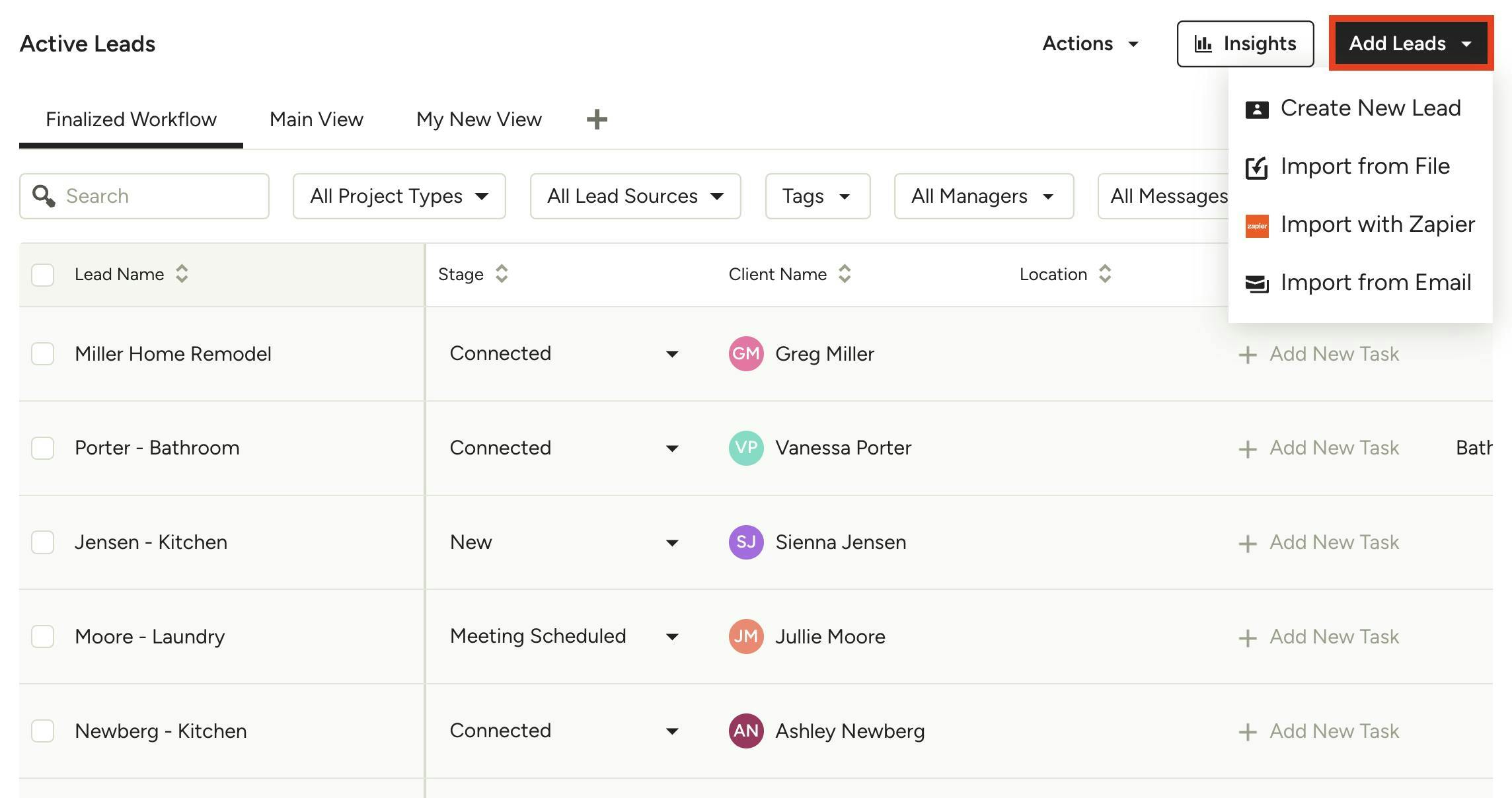 To do this, simply click the Add Leads button at the top right of your leads list. You can select to Create New Lead, Import from File, Import from Zapier, or Import from Email.