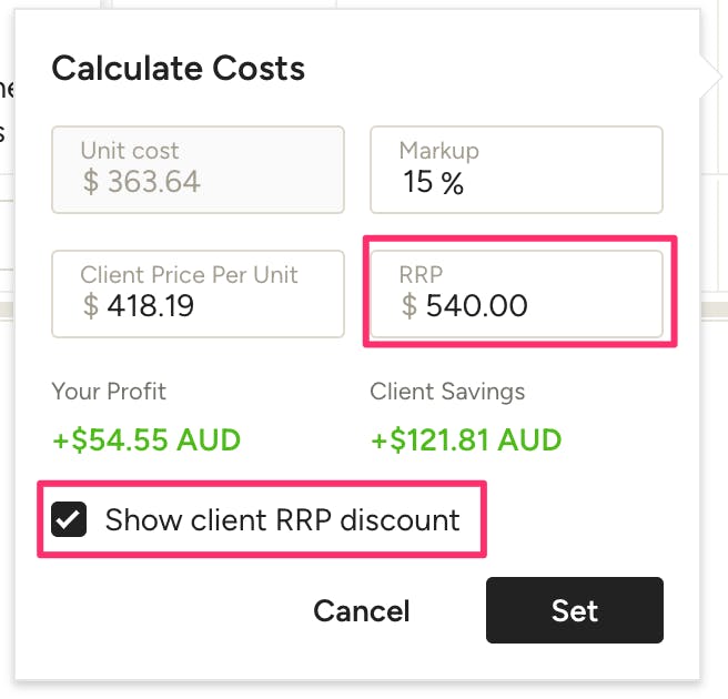 Click on the markup calculator. This will open up a popup that shows the RRP as set up on the product. If you haven't set the RRP on the product, or need to edit it, you can easily do so here. Once entered, you will see the Client Savings value below. To show this detail to the client, make sure the checkbox next to “Show client RRP discount” is selected.