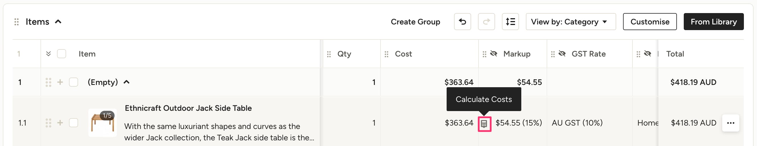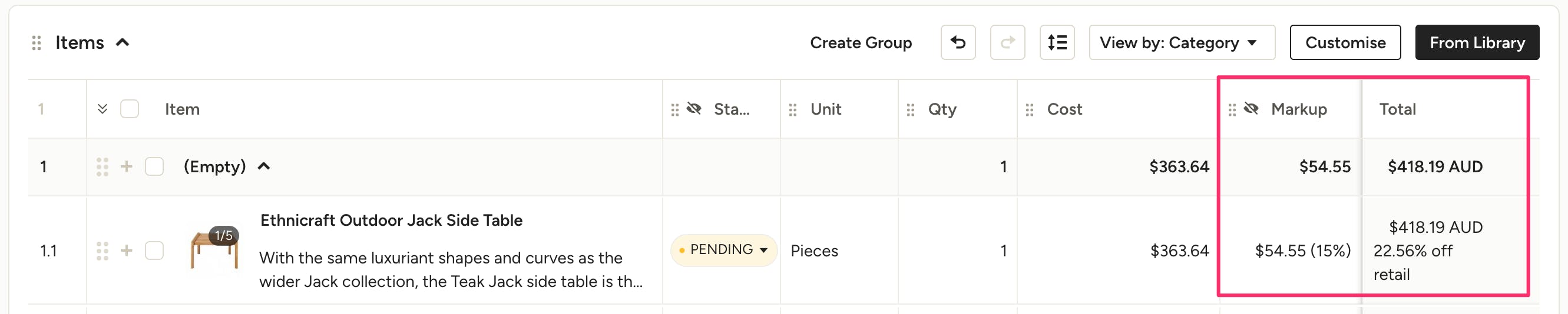So, how do you set the RRP discount? When creating a proposal or invoice, first you have to make sure to have the Markup column shown in editing mode (if it doesn't show, click the Customise button and toggle on Markup in the Settings).