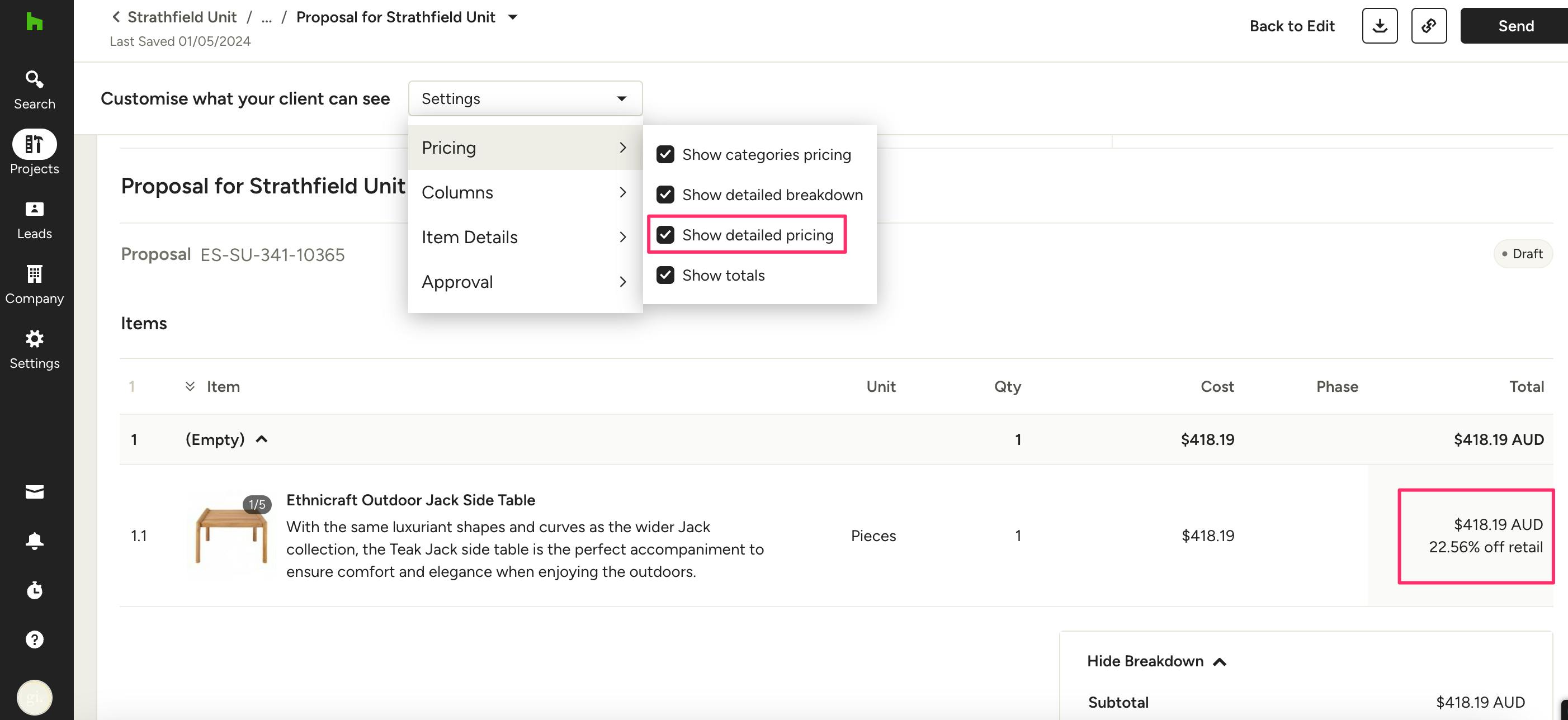 To make sure the RRP discount is shown to your client, click Preview in the top right of the document. Then click the Settings dropdown next to "Customise what your client can see" on the top, and make sure “Show detailed pricing” in the Pricing section is selected. You will now see the "% off retail" show in the item total(s) that you marked as “Show client RRP discount” — this preview is what your client will see when you share the document.