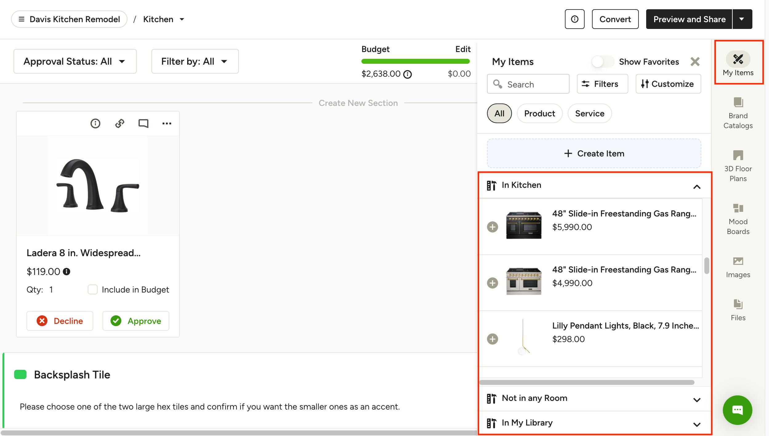 From within any board, click on My Items on the right panel. Here is where you will find all items that have been added to your library, either manually or via the Clipper. If you selected a specific project and/or room when clipping an item, you will find it under that specific room, like "In Kitchen", or under "Not in any room". If you haven't yet added an item to your specific project, you can find all clipped items under "In My Library". Use the filters and search bar it the top to quickly find what you're looking for. Click the item to add it to your board.