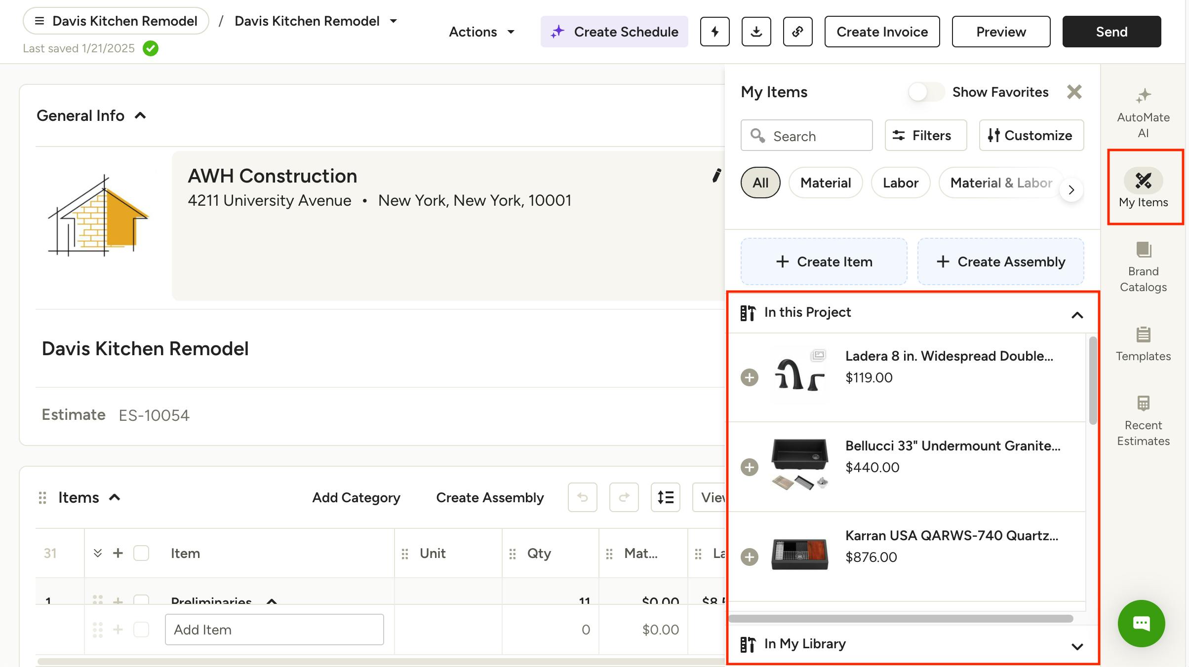 From within any estimate/proposal or invoice, click on My Items on the right panel. Here is where you will find all items that have been added to your library, either manually or via the Clipper. If you selected a specific project when clipping an item, you will find it under that "In this Project". If you haven't yet added an item to your specific project, you can find all clipped items under "In My Library". Use the filters and search bar it the top to quickly find what you're looking for. Click the item to add it to your document.