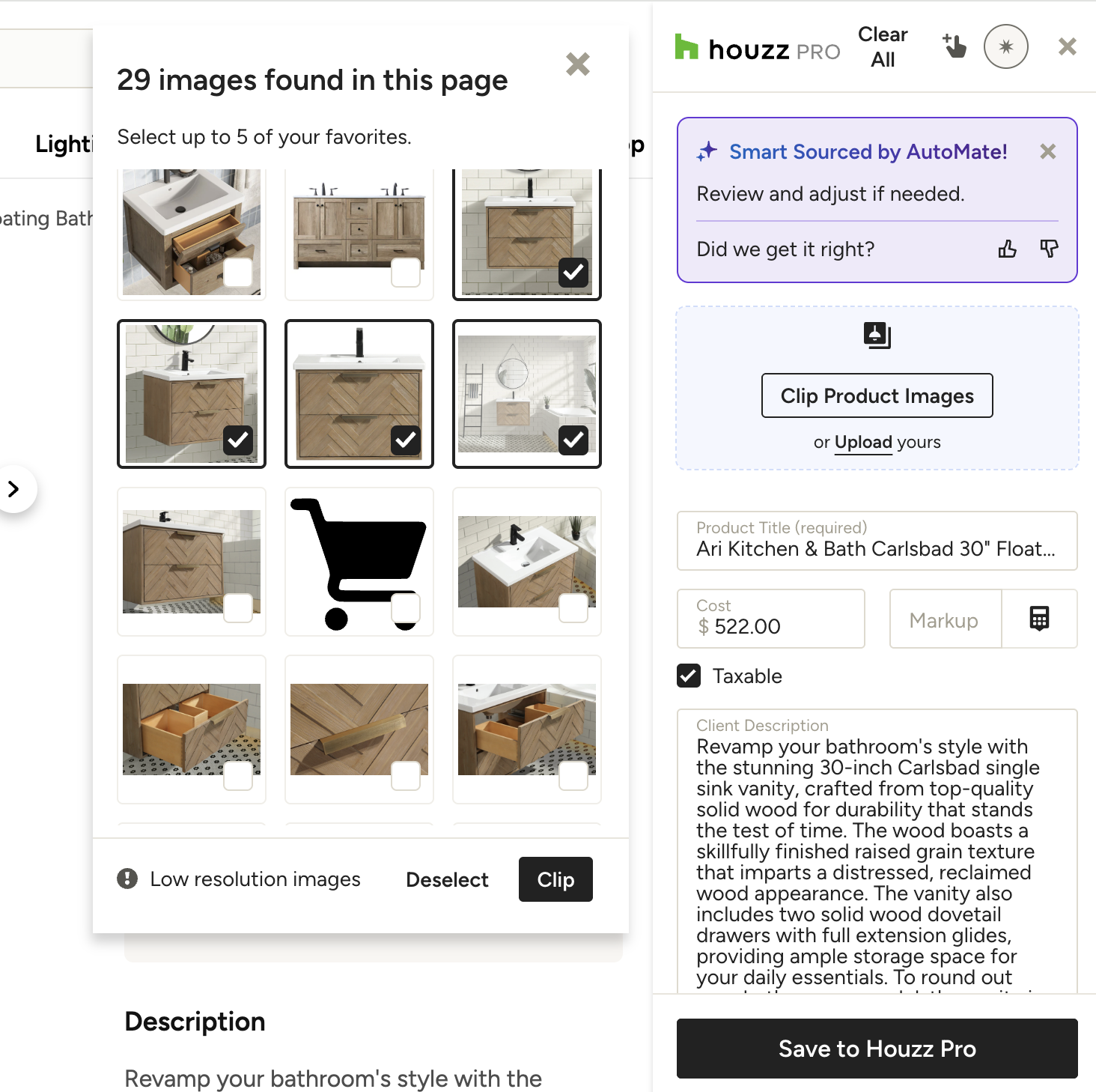 When you're done sourcing product details, click Save to Houzz Pro at the bottom of the Clipper. You can then choose to continue clipping additional products, or click to view the product in Houzz Pro.