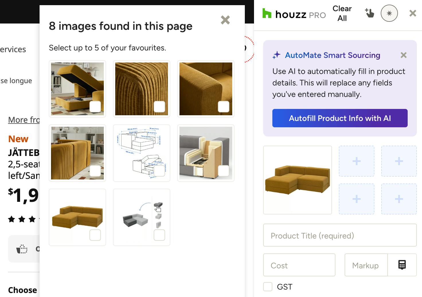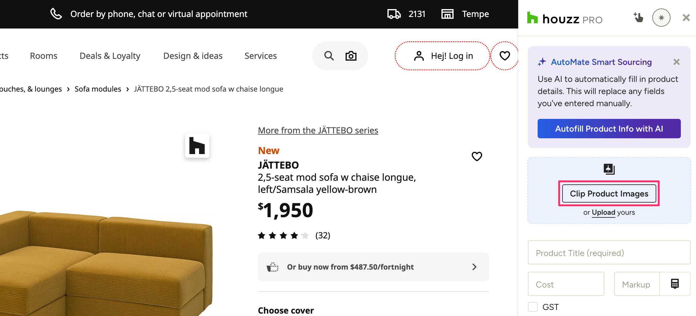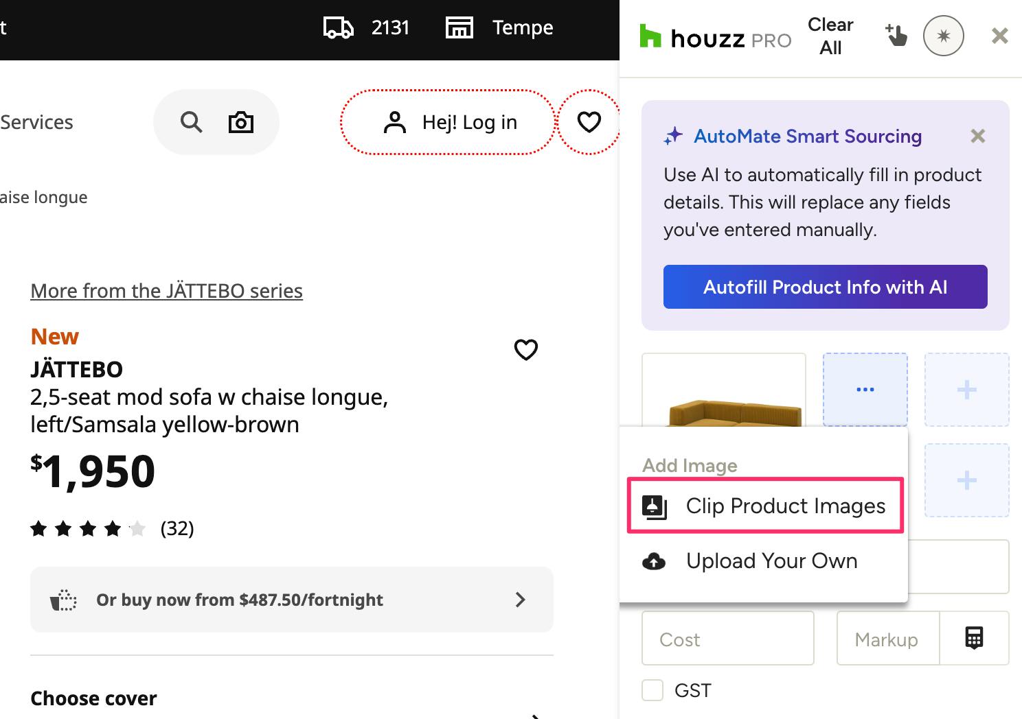 You will be prompted to sign into Houzz Pro in order to use the Clipper. Once signed in, go back to the website you want to clip from. With the Clipper open, you can start manually filling in details and information about the product you wish to clip, or turn on AutoMate Smart Sourcing to automatically fill in details (learn more about AutoMate Smart Sourcing below).