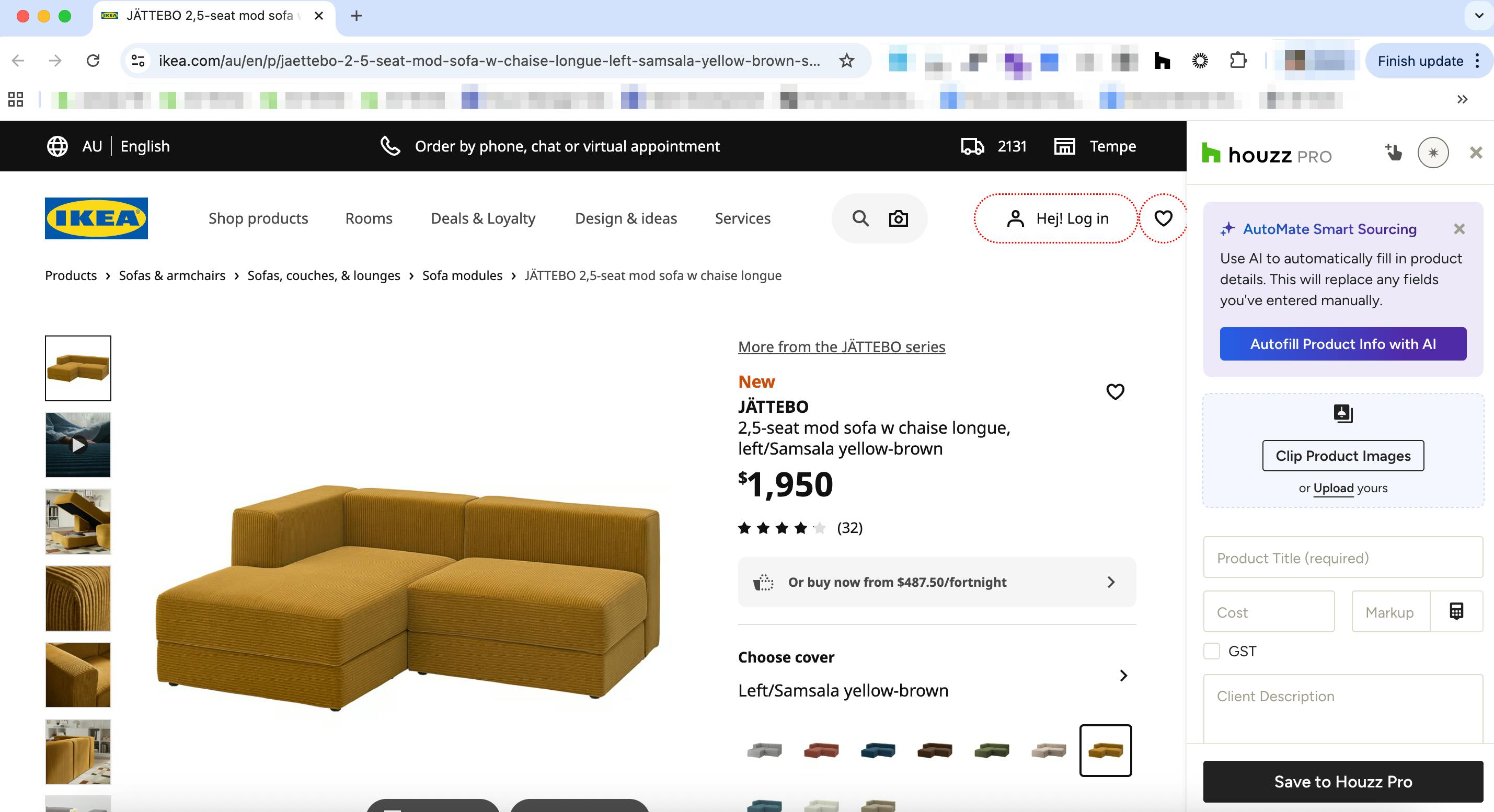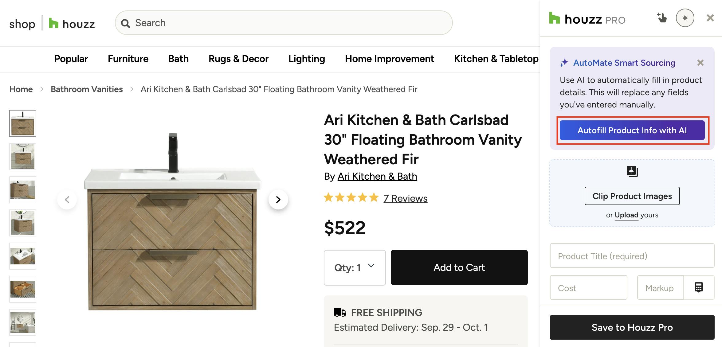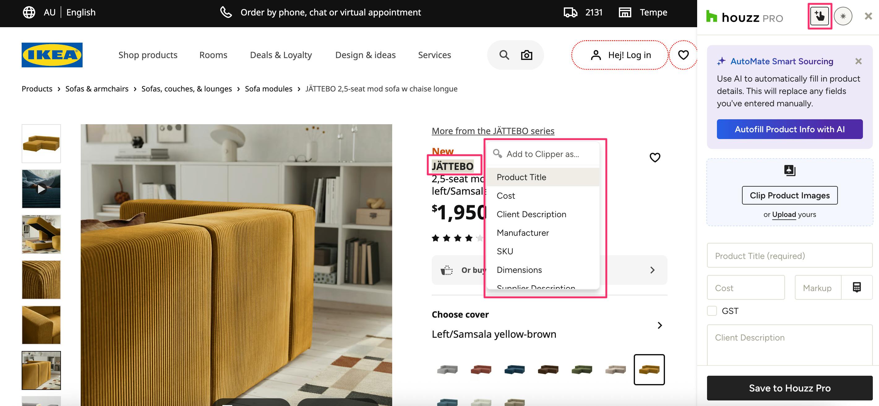 You will be prompted to sign into Houzz Pro in order to use the Clipper. Once signed in, go back to the website you want to clip from. With the Clipper open, you can start manually filling in details and information about the product you wish to clip, or turn on AutoMate Smart Sourcing to automatically fill in details (learn more about AutoMate Smart Sourcing below).